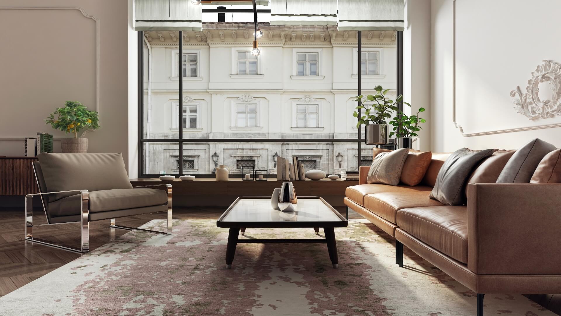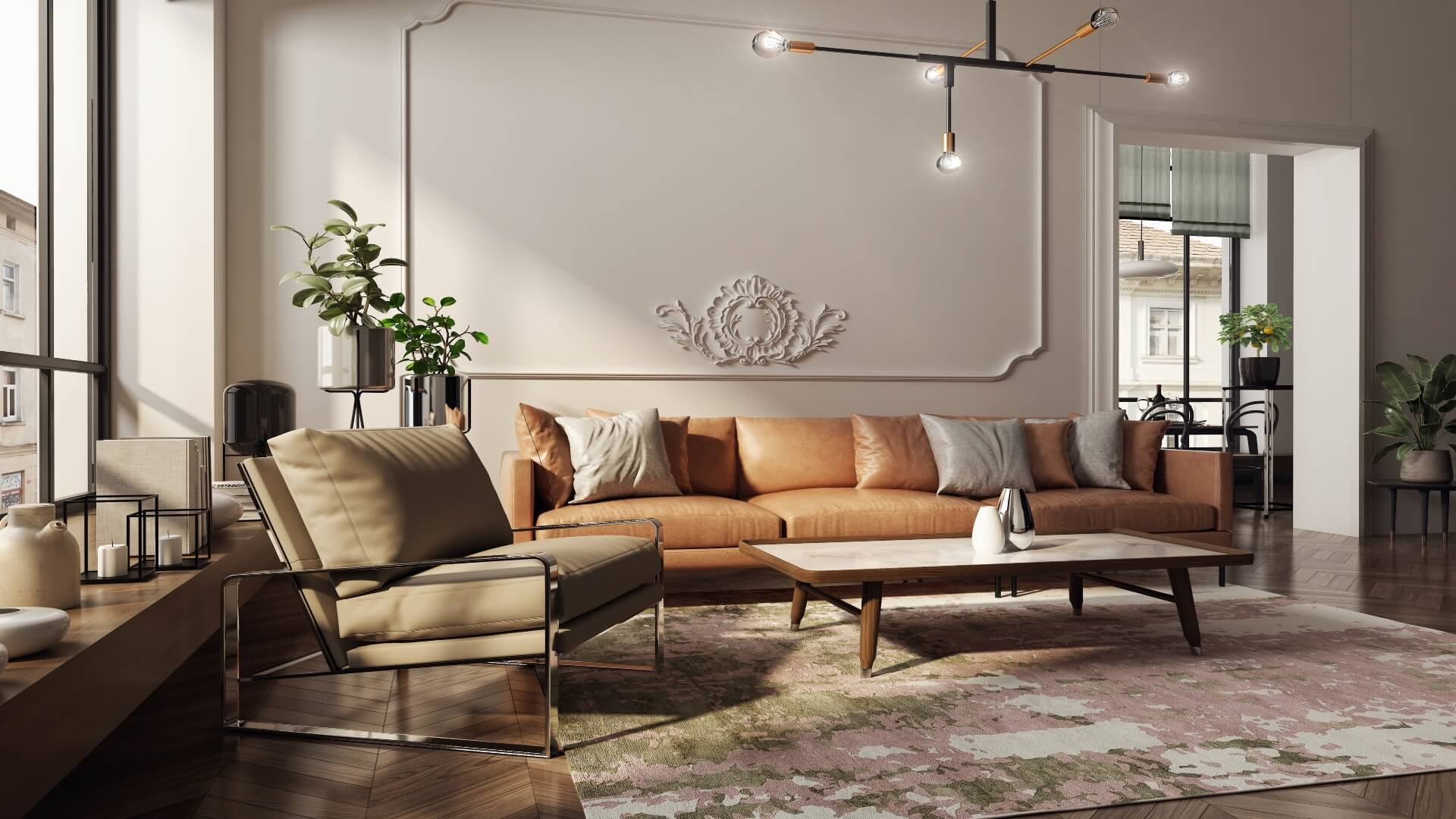 Modern glamour – w mieszkaniu w kamienicy można też wnętrza zaaranżować w nowej odsłonie stylu glamour. Od klasycznej wersji różni się m.in. wykorzystaniem innych kolorów – zamiast mocnych barw kamieni szlachetnych, dominują neutralne beże, ciepłe biele, jasne brązy. Mniej jest też błysku kryształów, a więcej mebli o doskonałym wykończeniu i prostej linii. Doskonale pasują do niego sztukaterie sufitowe i ścienne, a także boazerie angielskie.
