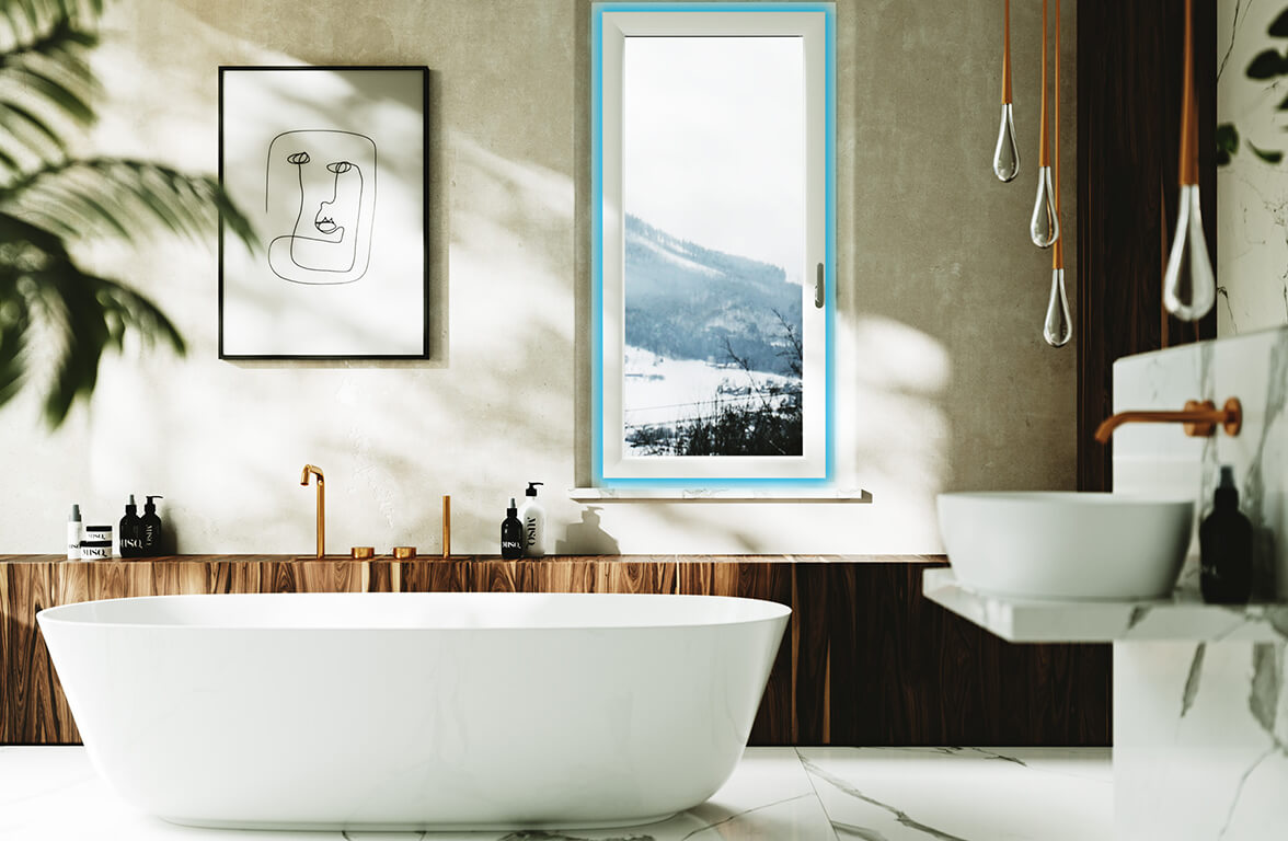 Ważnym elementem okna łazienkowego będzie wprowadzanie dużej ilości światła. Odpowiada za to konkretny parametr Lt, który znajdziemy w specyfikacji technicznej okna. Systemy okienne o wąskich profilach pomogą nam jak najbardziej zutylizować światło dzienne. Przykładem takiego systemu jest Oknoplast Prolux— autorska konstrukcja profilu PVC ramy i skrzydła oraz większa powierzchnia szyby, które zapewniają o 22% więcej światła niż standardowe okna PVC.